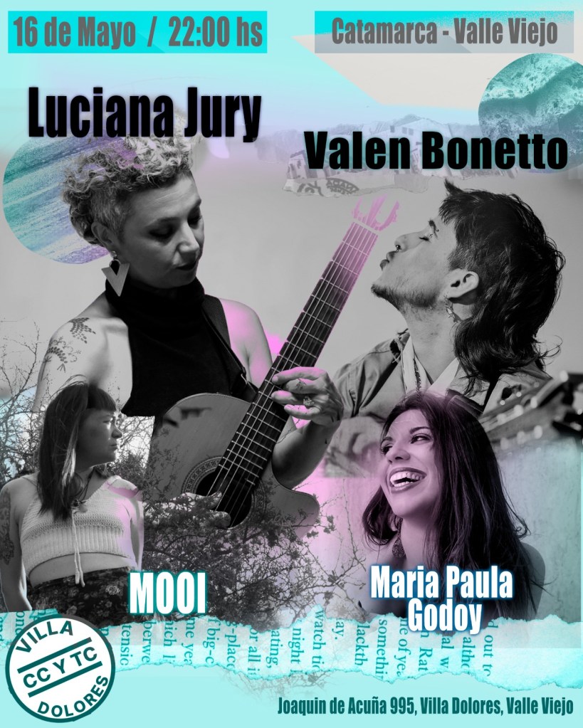 Cuatro artistas se reúnen en Catamarca para compartir una noche de música, poesía y diversidad: Luciana Jury, Valen Bonetto, Maria Paula Godoy y Mooi se presentarán el viernes 16 de mayo a las 22:00 hs en el Centro de Cultura y Trabajo Comunitario Villa Dolores, Valle Viejo.