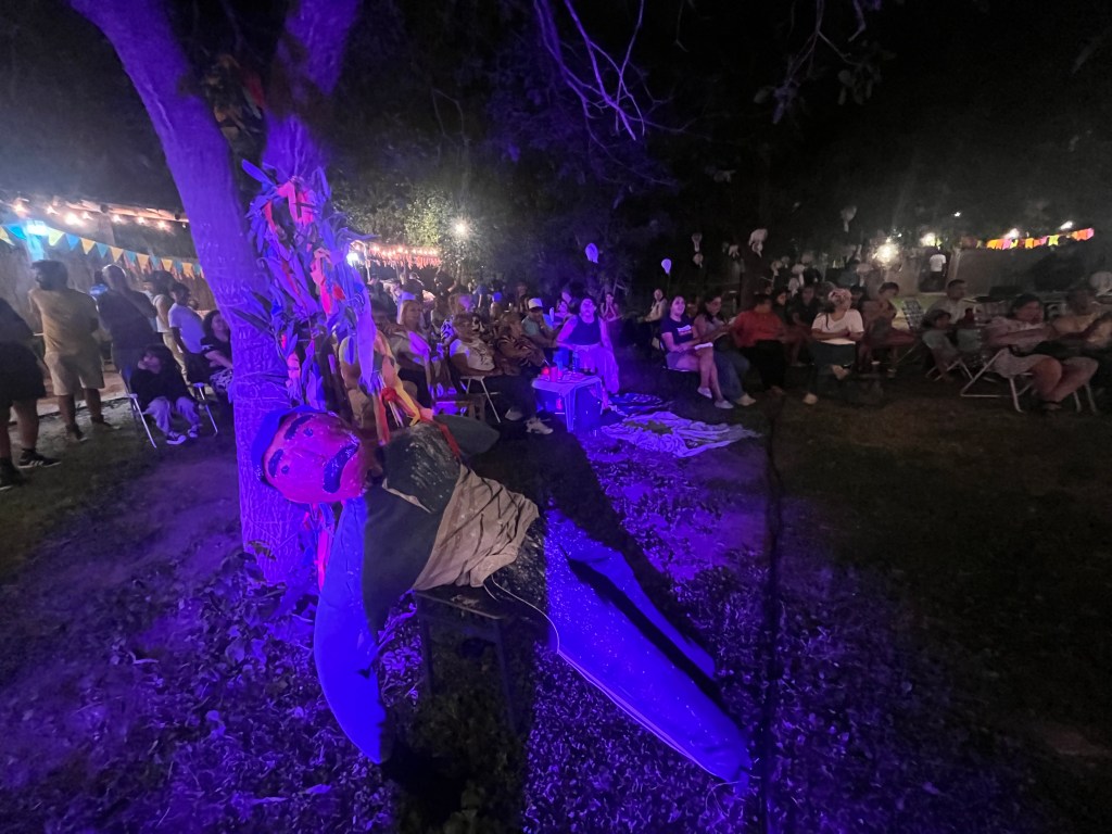 La noche se fue tejiendo como una verdadera crónica viva del carnaval. Desde temprano comenzaron a sonar cajas y coplas; el patio se llenó de harina, albahaca y papel picado. Las rondas de danza se armaron espontáneamente, mezclando generaciones, y el teatro dio vida a los personajes tradicionales que encarnan el espíritu de la chaya. Cada momento fue sostenido por el trabajo colectivo: quienes organizaron, quienes cocinaron, quienes montaron sonido y escenario, quienes recibieron al público y quienes sostuvieron cada detalle para que la fiesta fuera posible.