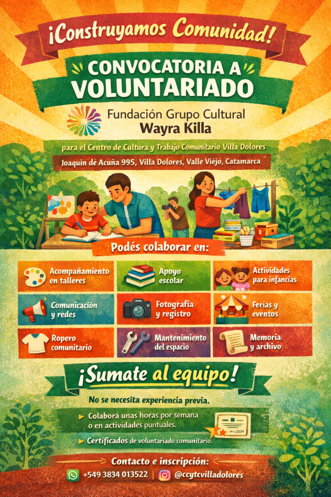 Formá parte de la comunidad del Centro Cultural sumándote al programa de Voluntariado o hacer aportes económicos en el círculo de amistades del Centro de Cultura y Trabajo Comunitario Villa Dolores.